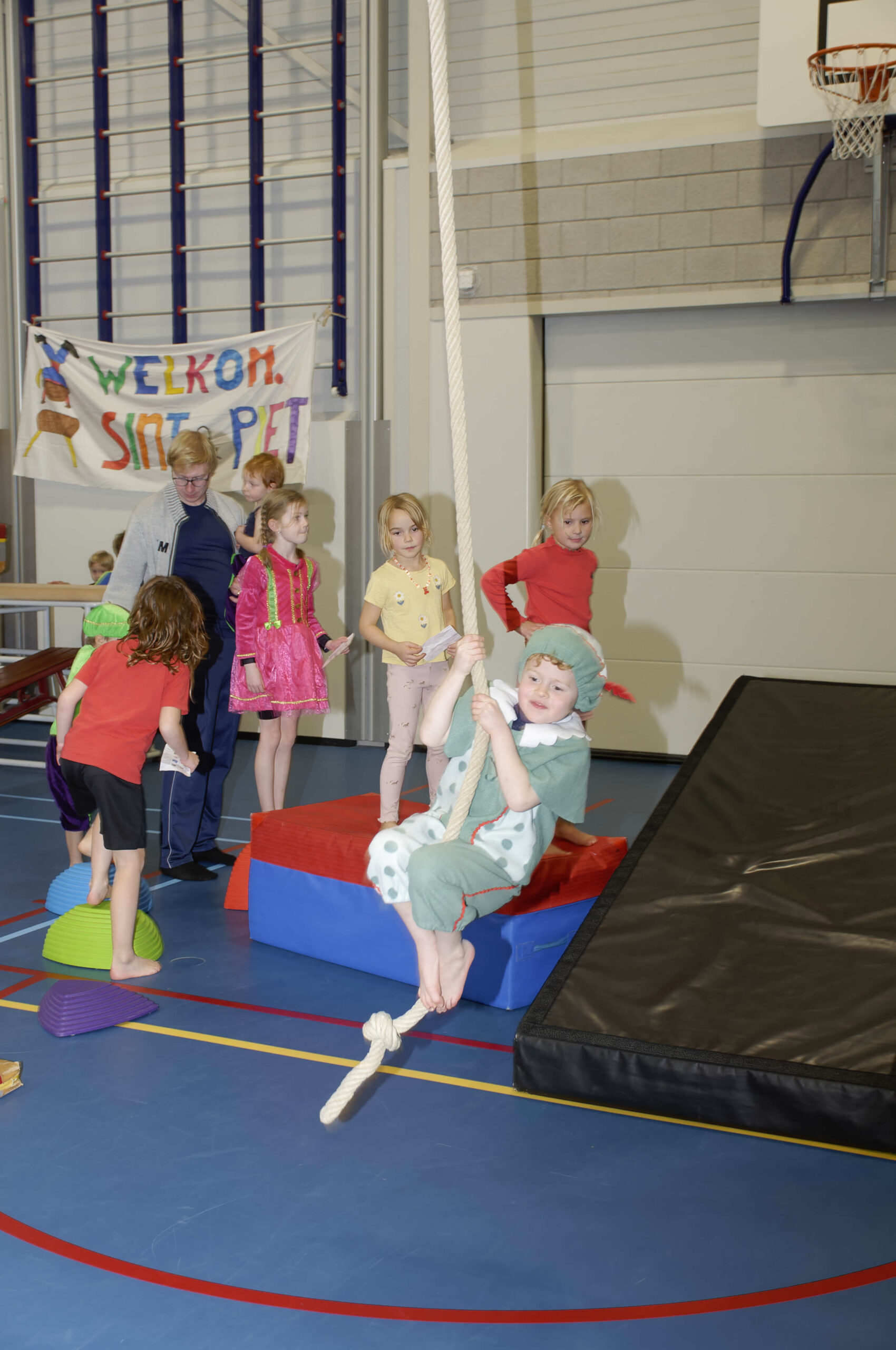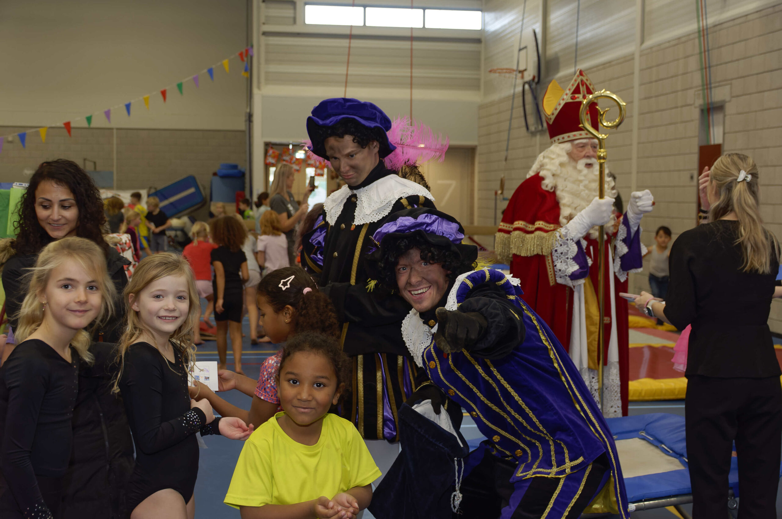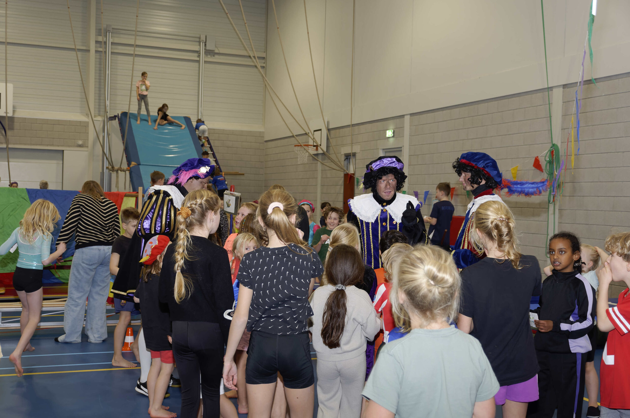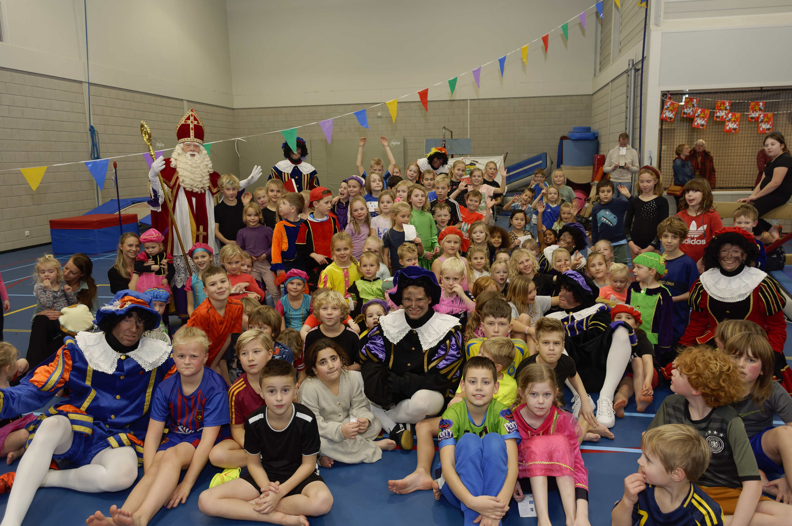 Volop belangstelling voor de pietengym op 26 november. Overal in de zaal konden de jongste kinderen meedoen aan allemaal uitdagende sinterklaasopdrachten. Er werd geklommen op de daken, stoomboot varen, zwaaien en zwieren en nog veel meer. Gelukkig hadden Sil, Eva en Kevin voldoende hulp om alles te regelen en te begeleiden. Ook Sinterklaas met kwam even op bezoek om te genieten van alle kunsten en capriolen die de kinderen al konden laten zien. De meegekomen pieten wisten wel hoe ze de verschillende hindernissen moesten nemen. Al met al weer een geslaagde middag.