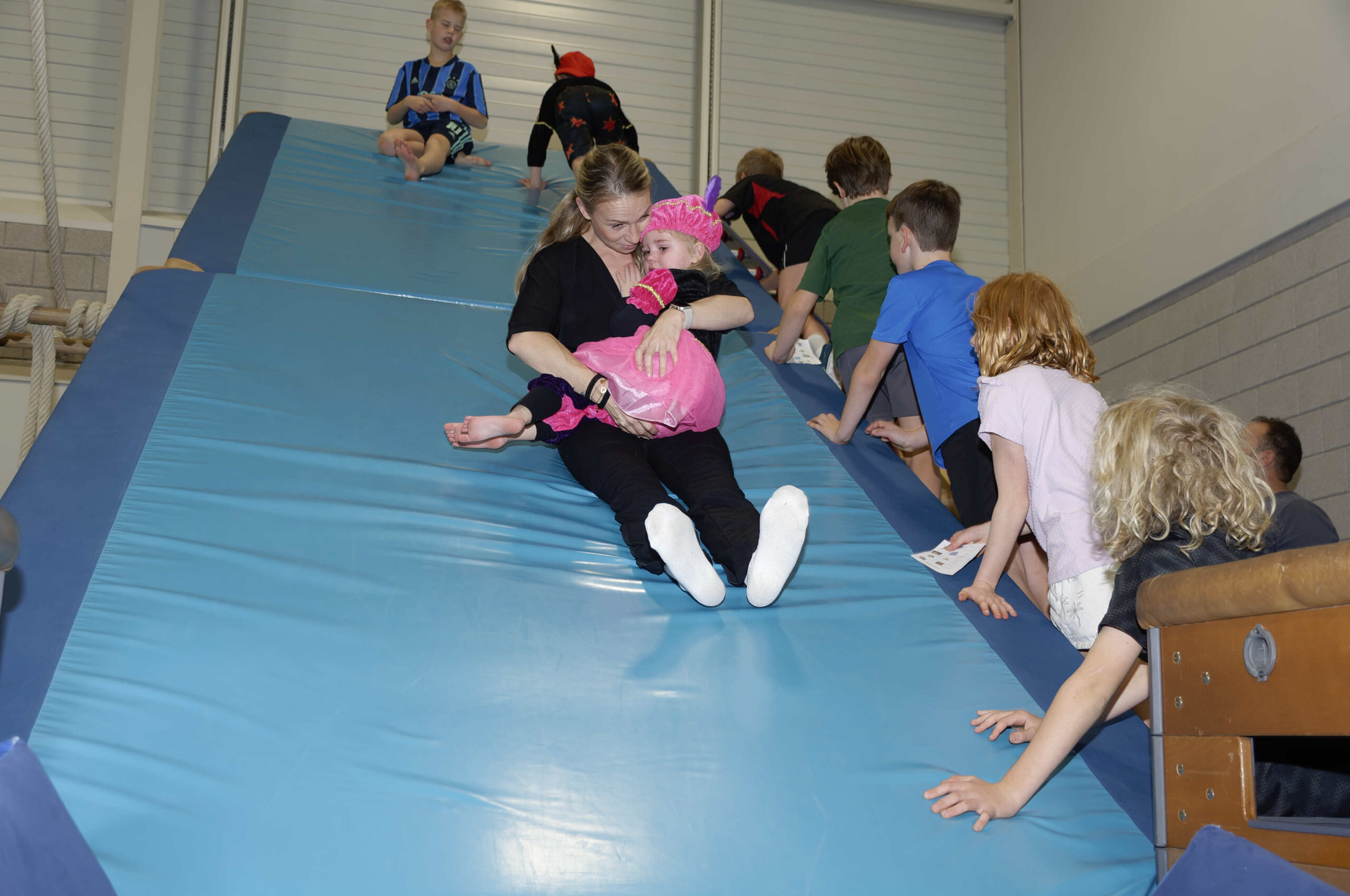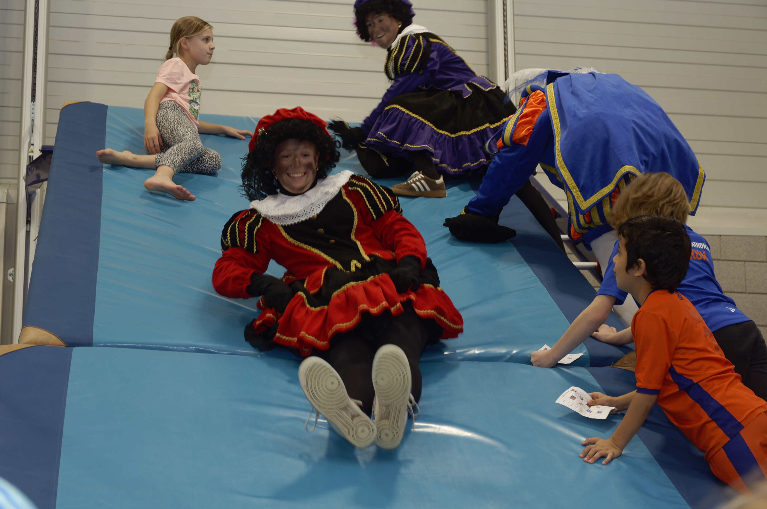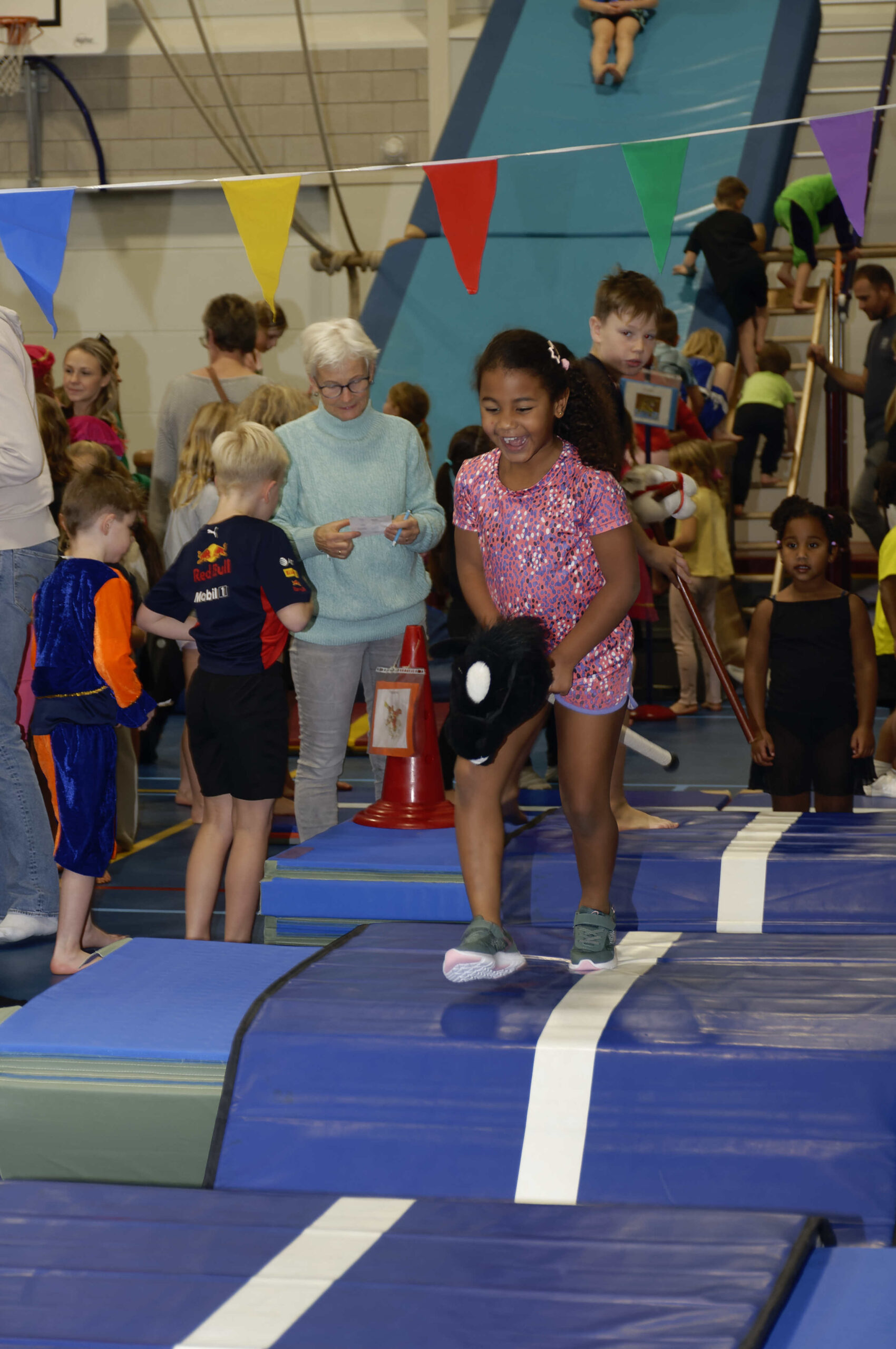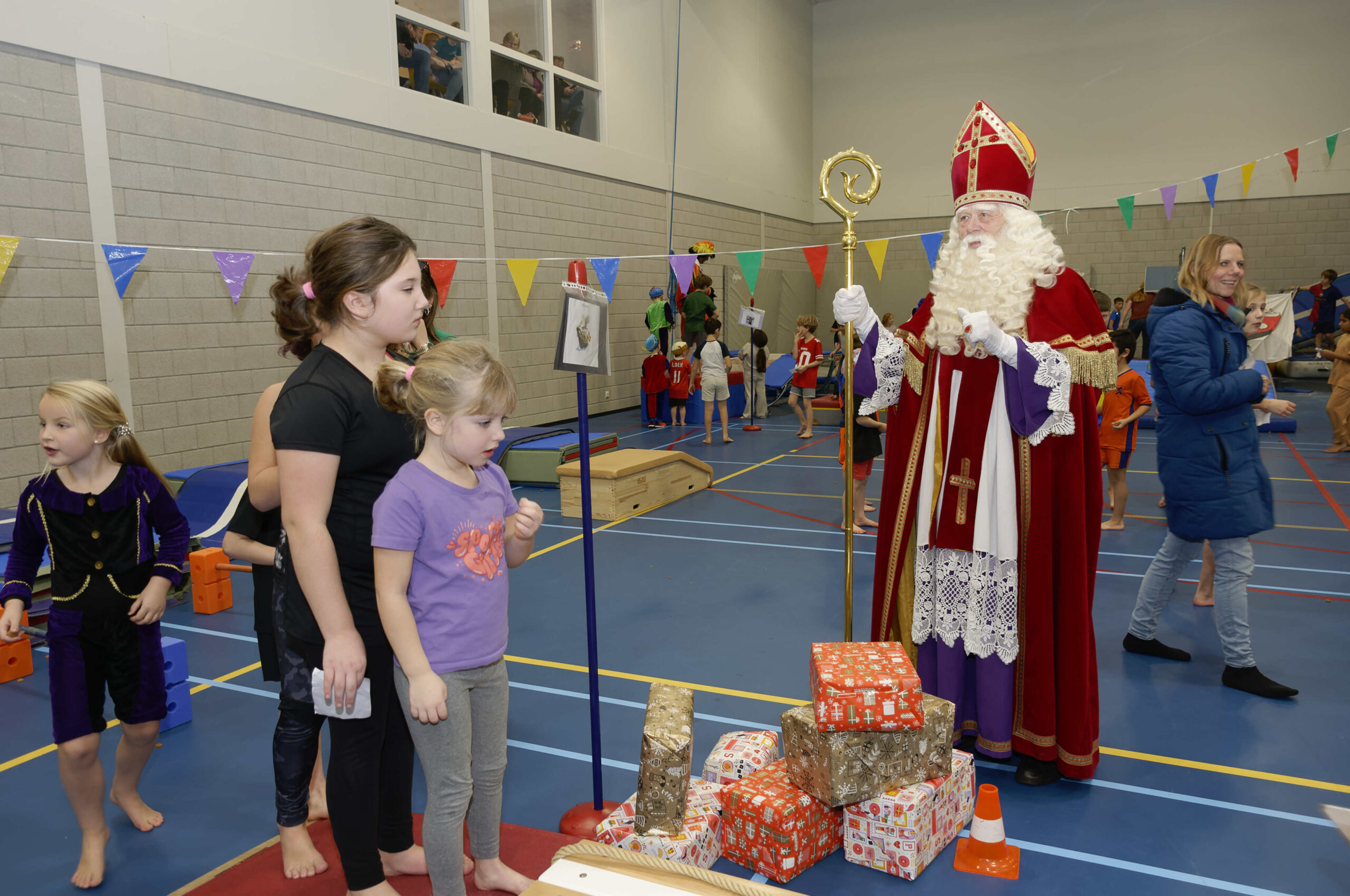 Volop belangstelling voor de pietengym op 26 november. Overal in de zaal konden de jongste kinderen meedoen aan allemaal uitdagende sinterklaasopdrachten. Er werd geklommen op de daken, stoomboot varen, zwaaien en zwieren en nog veel meer. Gelukkig hadden Sil, Eva en Kevin voldoende hulp om alles te regelen en te begeleiden. Ook Sinterklaas met kwam even op bezoek om te genieten van alle kunsten en capriolen die de kinderen al konden laten zien. De meegekomen pieten wisten wel hoe ze de verschillende hindernissen moesten nemen. Al met al weer een geslaagde middag.